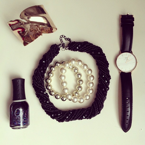 MOJE LOVE! Lakier ORLY z kolorowymi migoczącymi błyskotkami, do tego zegarek jaki nosze systematycznie i perełki.