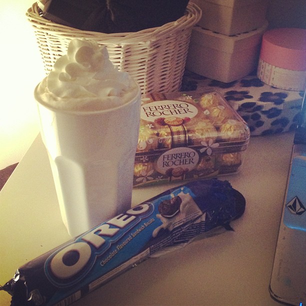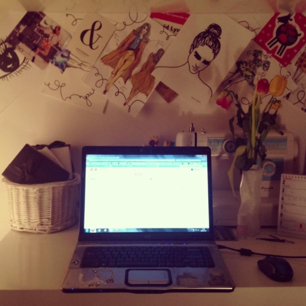 Moje rysunki, ulubione pocztówki, mój laptop, kwiatki od chłopaka, i tony KAWY, zawsze, a do tego słodycze!