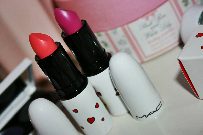 Najpierw szminki. Moim wymarzonym kolorek była szminka Betty Bright, to ta brzoskwiniowa. Jak tylko zobaczyłam ją w zapowiedziach kolekcji marzyłam, żeby ją mieć. Drugi kolor to odcień od Veroniki, Daddy's Little Girl. To taki piękny ocień fioletu. Szminki jak na MACa przystało są najlepsze! Nawilżanie i mocny kolor idą w parze. Do tego te piękne opakowania białe w serduszka z buziami bohaterek. Genialne!