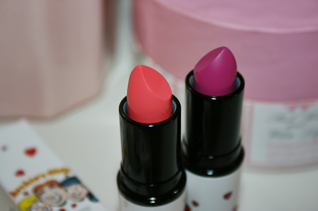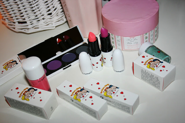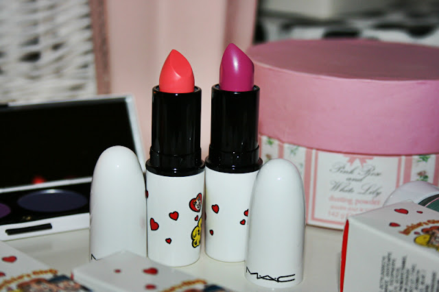 Najpierw szminki. Moim wymarzonym kolorek była szminka Betty Bright, to ta brzoskwiniowa. Jak tylko zobaczyłam ją w zapowiedziach kolekcji marzyłam, żeby ją mieć. Drugi kolor to odcień od Veroniki, Daddy's Little Girl. To taki piękny ocień fioletu. Szminki jak na MACa przystało są najlepsze! Nawilżanie i mocny kolor idą w parze. Do tego te piękne opakowania białe w serduszka z buziami bohaterek. Genialne!