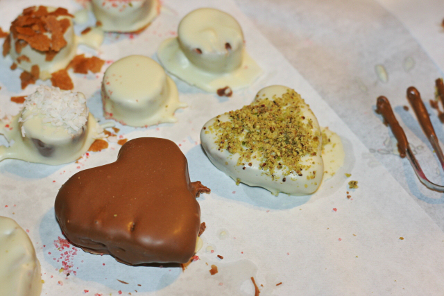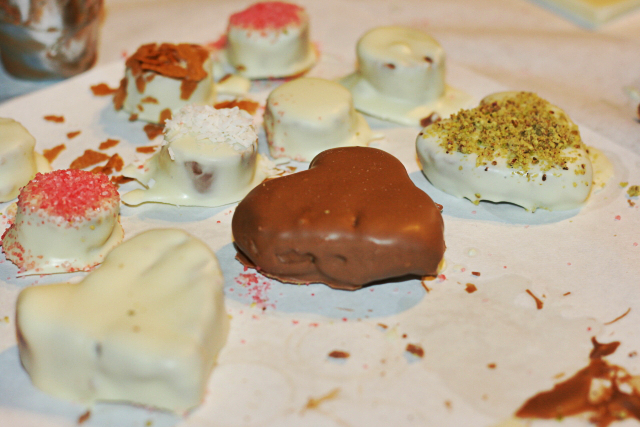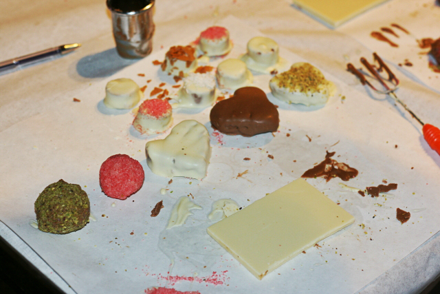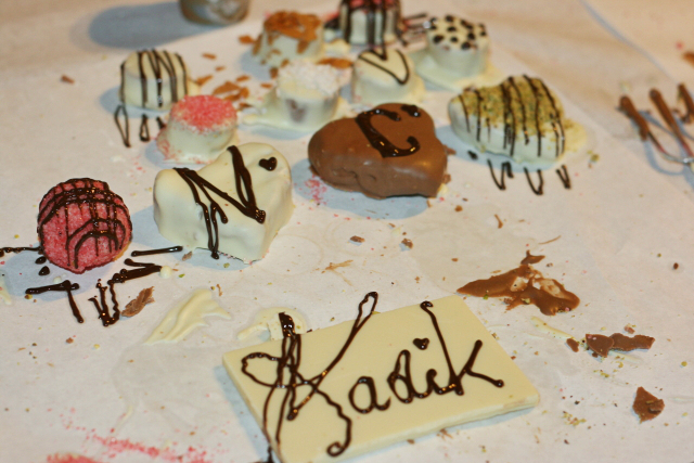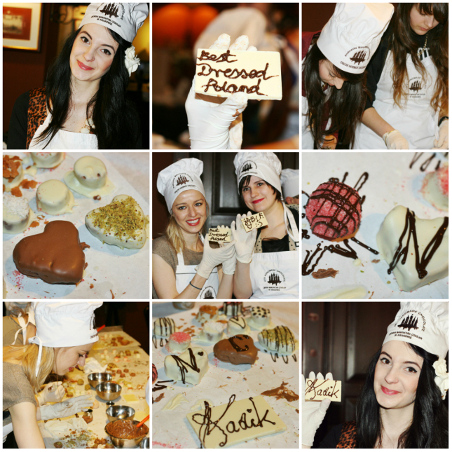 Każda z nas miała swoje stanowisko, jakie początkowo tworzyły widełki, biała czekolada, pralina, do tego nugat. Naszym celem było stworzenie swoich pralinek. Miałyśmy do dyspozycji posypki, płynne czekolady i rękawy z czekoladą do dekoracji.