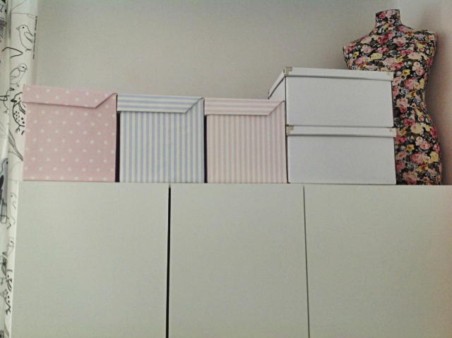 Moja szafa, cała biała, a na niej pudła w pastelowych kolorach, chce wszystkie kolory z pokoju zamienic na właśnie takie pastele, chce pozbyć się wszystkiego co jest aktualnie czarne.
