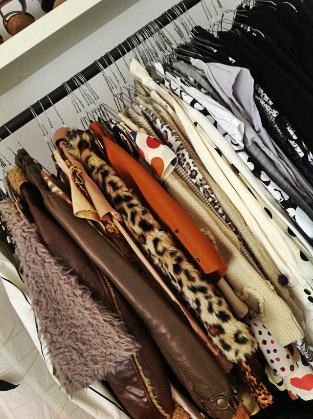 Pudła pod wieszakiem wszystkie okleję tapetami w pastelowe kolory, dokładnie takimi samymi jakie są teraz na mojej szafie. Na wieszaku są ubrania od beżu po czerń, wszelakie kolory schowałam do szafy.