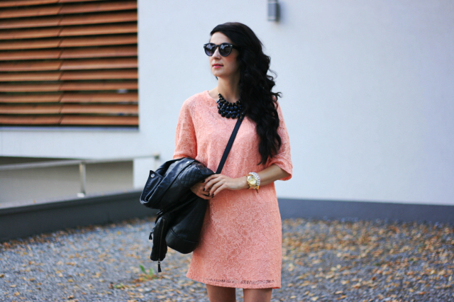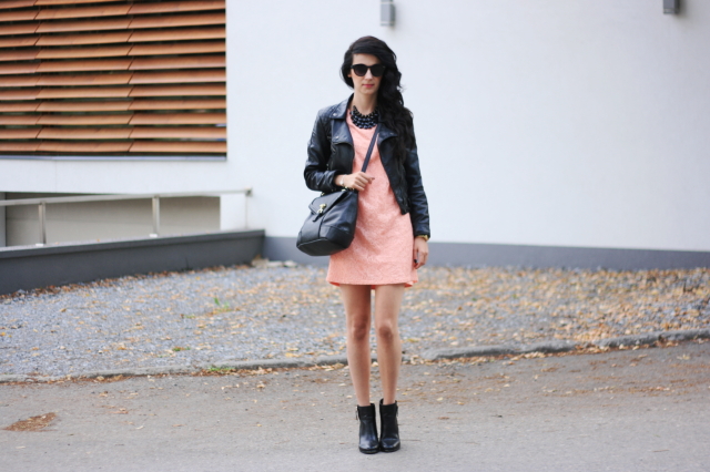 śliczna stylizacja i pięknie prezentuję się brzoskwiniowy kolor sukienki z czarną ramoneską ;)