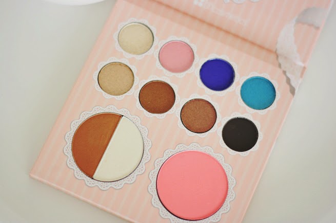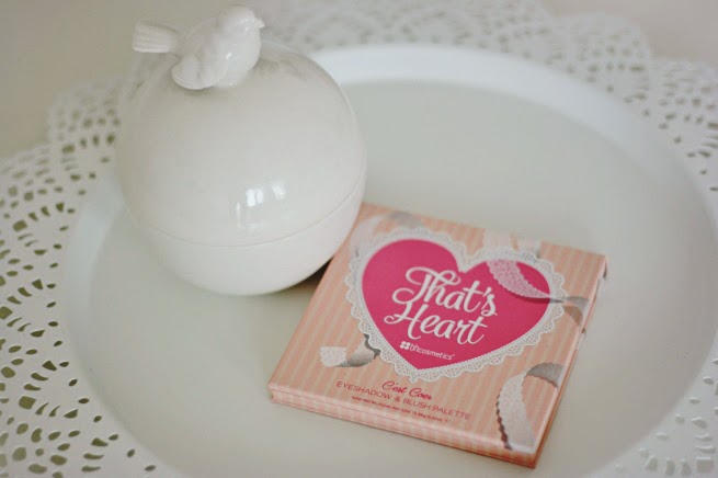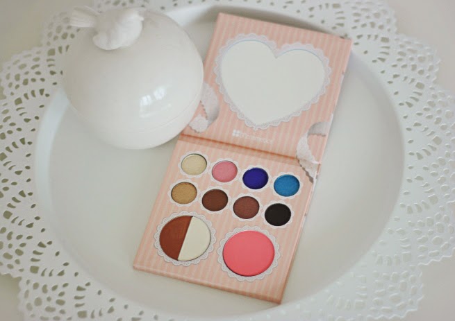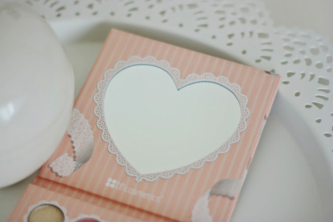 Pierwsza paletka That's Heart to połączenie cieni z różem. Urocza, pastelowa w dodatku w serduszka i koronki. Myślałam, że jest mniejsza, a miło mnie zaskoczyła wielkość. Duża paleta, po otwarciu ukazuje nam lusterko na jednej stronie, a na drugiej kolorówkę. 8 cieni do oczu, to mieszanka kolorów, od jasnego beżu, przez róże i fiolety, aż po bardzo ciemny brąz.