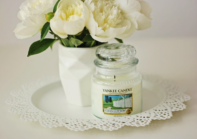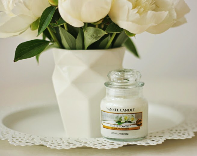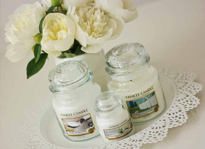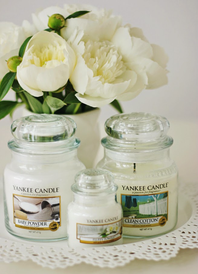 Wiecie, że nasz dom wypełnił się po brzegi bielą. Dlatego świece także chciałam wkomponować w całość. Uwielbiam słodkie zapachy, czekoladowe, ciasteczkowe, karmelowe, a te są zupełnie czymś nowym. Byłam bardzo ciekawa wychwalanym CLEAN COTTON Yankee Candle. Do tego kusząca nazwa BABY POWDER i FLUFFY TOWELS.