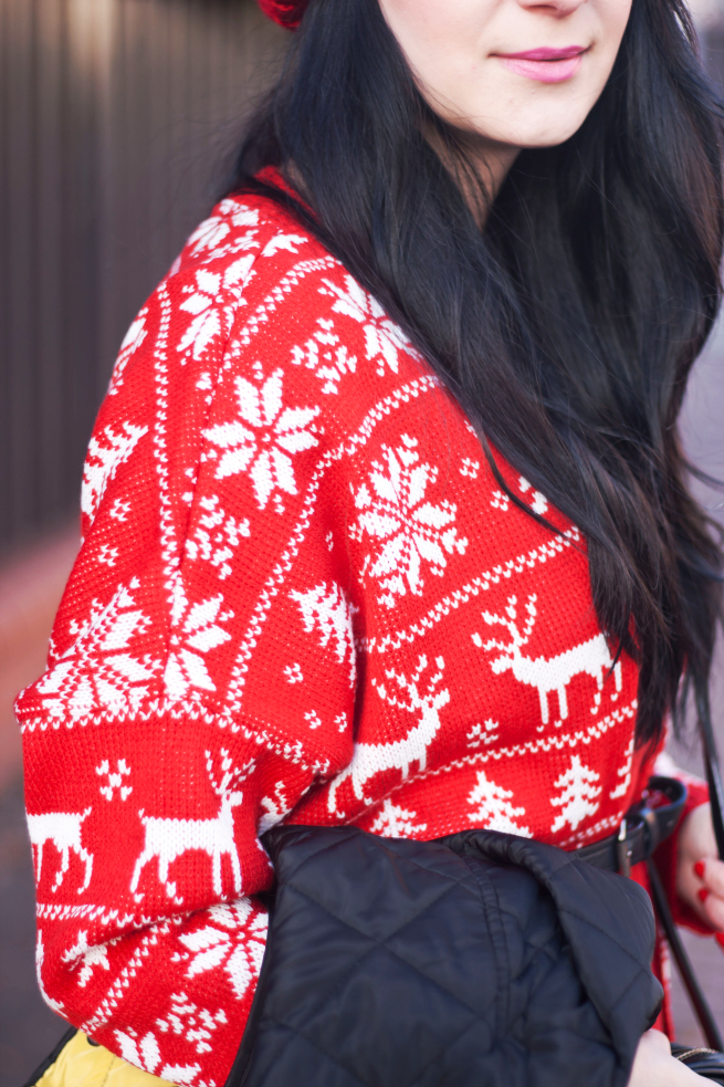 Wszystko w koło przypomina mi o nadchodzących świętach! Choinki na każdym kroku, zapach pierniczków u mamy w domu, poduszki w renifery i tłumy ludzi w każdym sklepie o każdej porze. Taka mała gorączka przedświąteczna już zaczęła się na dobre. Zatem i ja dziś dostosowuję się do otoczenia i wskakuje w świąteczny sweter i emanuję radością! Uśmiecham się od ucha do ucha i polecam zaskoczyć domowników świątecznym swetrzyskiem tak jak zrobiłam to ja.