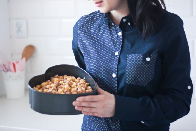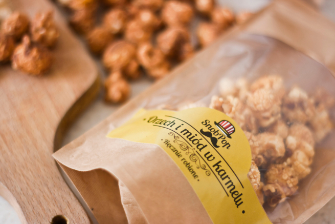 A z popcornem to dłuższa historia. W moim mieście powstała manufaktura popcornu w karmelu SnobPop. Ooblany własnoręcznie robionym karmelem z dodatkiem naturalnych składników, który tworzy pyszną przekąskę. Aktualnie można kupić 5 jego smaków: Karmel, Migdały w karmelu, Orzechy i miód w karmelu, Sól morska w karmelu i Karmel w czekoladzie. Możliwości smakowe są nieograniczone. I to wszystko w naszym małym mieście :) Wszystkie składniki nie zawierają glutenu. Specjalne połączenie składników sprawia, że smaki uwalniają się stopniowo, najpierw smak karmelu by później poczuć poszczególne dodatki.