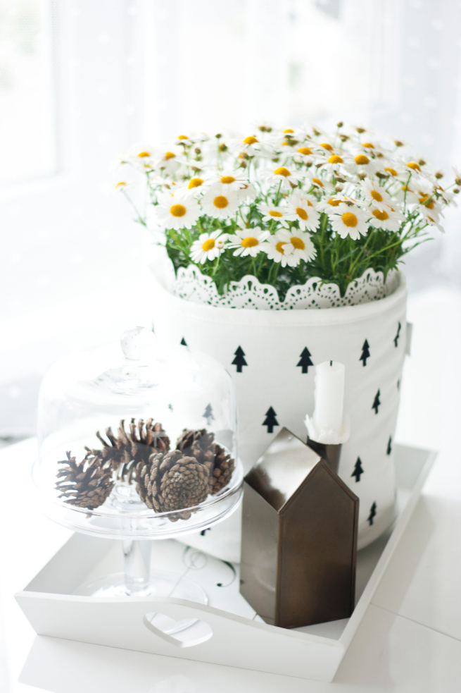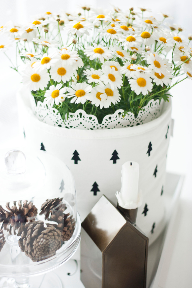 Kwiaty schowałam w koszyku w choinki, a do patery schowałam szyszki znalezione na spacerze. To taka moja zimowa wersja na lato z tymi kwiatami w skandynawskich choinkach.