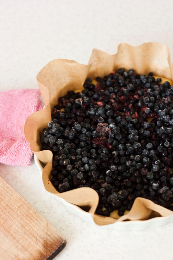 Podana porcja wystarczy na klasyczną blachę 24x30 albo tak jak ja wylałam na formę do tarty. Ciasto można zasypać jagodami mrożonymi/świeżymi, rabarbarem albo truskawkami. Co tylko przyjdzie wam do głowy :)