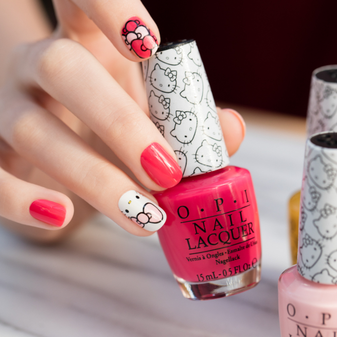 W kolekcji Hello Kitty by OPI znajdują się wszystkie odcienie, które są charakterystyczne dla tej postaci. Można zatem namalować ją na paznokciach. Klasyczną czernią obrysujemy postać kotki, a syrenią perłową bielą ją wypełnimy. Żółtym kolorem namalujemy nosek, a ubrania skomponujemy z kilku odcieni cukierkowego różu, a także granatu. Klasyczna czerwień, niczym wisienka na torcie zaakcentuje charakterystyczną kokardę Kitty White. Blasku postaci doda oczywiście różowy brokat.