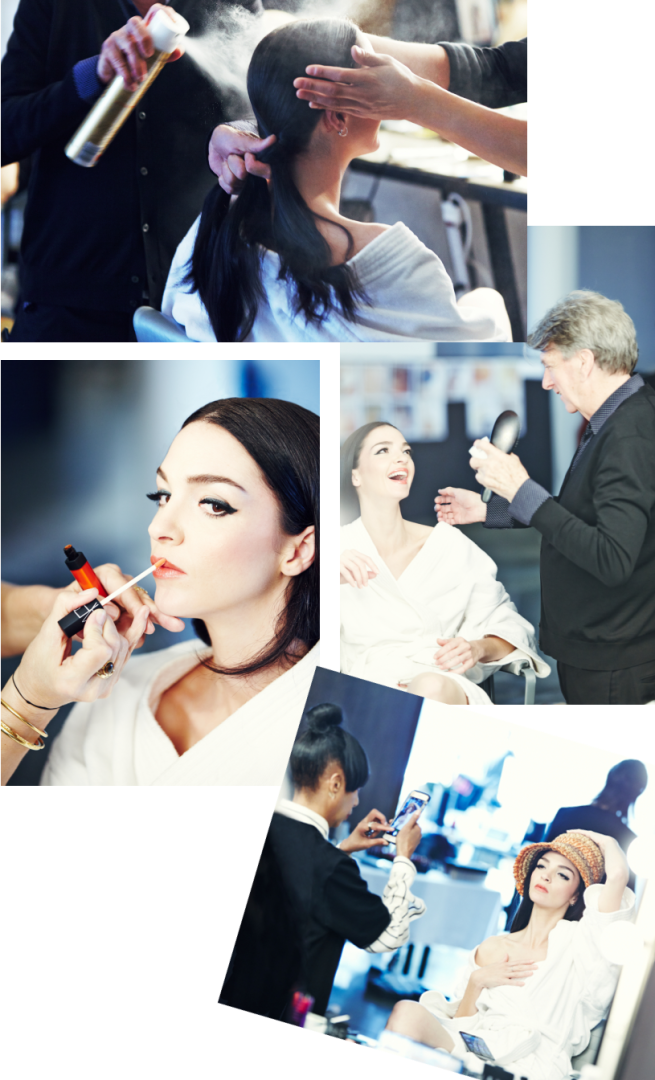 Do stworzenia efektu kokieteryjnej cery, na skórę modelki nałożono bazę Pore Refining Primer oraz nawilżający krem koloryzujący Pure Radiant Tinted Moisturizer SPF 30 - St. Moritz. W dalszej kolejności kremowy Orgasm Multiple w sztyfcie został nałożony w zagłębienia policzków i ku górze w kierunku skroni a następnie roztarty opuszkami palców, okrężnymi ruchami, dla uzyskania efektu pełnego rumieńca. Dla mocniejszego efektu róż Orgasm Blush został naniesiony na kości policzkowe przy pomocy pędzla do różu #20.