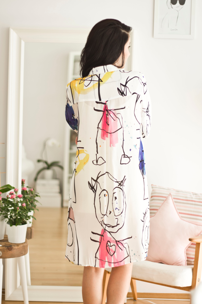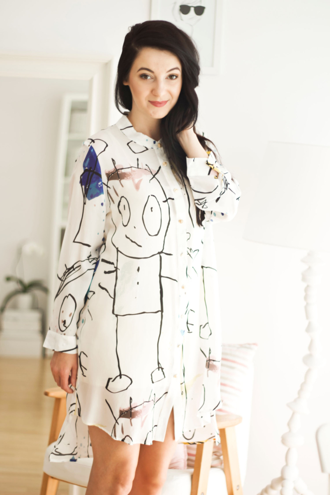 Moja koszula zdecydowanie się do Was uśmiecha. Kiedy zobaczyłam ją na stronie wiedziałam, że musi być moja. W głowie widziałam już stylizacje z nią. Na żywo okazała się jeszcze piękniejsza. Materiał jest delikatny, lekko prześwitujący, przez co doskonały na ostatnie gorące dni. A namalowane na niej rysunki są przepiękne. Koszula pochodzi ze sklepu VIPME.