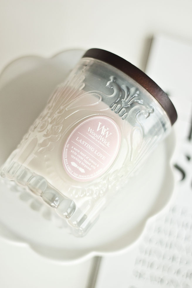 Kiedy zobaczyłam szkło świecy Wood Wick  z kolekcji Boudoir moje serce drgnęło. Już widziałam, że to nie tylko będzie wypełnienie zapachem mieszkania, a zdecydowanie użytkowa forma po wypaleniu świecy. Chciałabym aby kiedyś w tym szkle zamieszkały moje pędzle na toaletce i tak się kiedyś stanie. Choć świeca pachnie tak cudownie, że wskazane jest jej oszczędzanie.  Lasting Love to zapach zmysłowy, bardzo kobiecy, inspirowany latami 20stymi  XX wieku i stylem Art Deco. Mieszają się tu fiołki z nutami świeżej białej bergamotki, otoczone masa romantyzmu. Samo szkło wygląda jak rzeźbione i jest całkowicie eleganckie z nutką subtelności w postaci małych owalnych etykiet.
